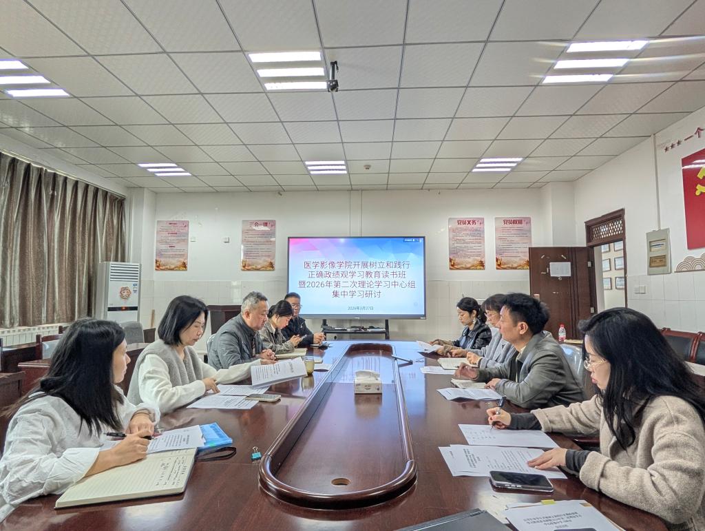 3月27日,医学影像学院在北京路校区基础二号楼八楼会议室举办树立和践行正确政绩观学习教育读书班暨2026年党委理论学习中心组第二次集中学习研讨会。学院党委书记彭安辉主持会议,各科室、教研室负责人,各支部书记,全体辅导员,师生代表列席会议。