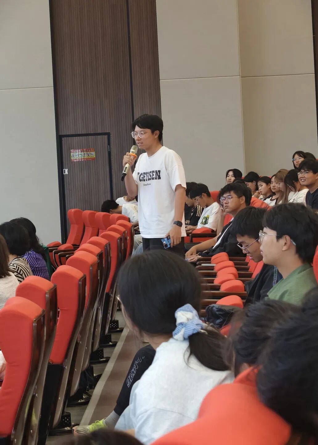 自由交流环节,新生们敞开心扉,踊跃提问,那些关于学业、关于未来的困惑与好奇,都在老师们耐心细致的解答中得到回应。一问一答间,师生情谊悄然升温,现场氛围热烈而融洽,满是温暖与真诚。
